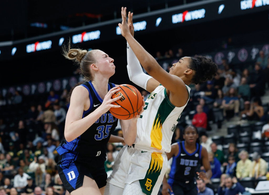 NCAA, College League, USA Womens Basketball: Oui-Play Paris-Duke at Baylor Nov 3, 2025 Paris, FRA Duke Blue Devils forward Toby Fournier 35 looks to score as Baylor Bears forward Bella Fontleroy 22 defends during the second half at Adidas Arena. Paris Adidas Arena FRA, EDITORIAL USE ONLY PUBLICATIONxINxGERxSUIxAUTxONLY Copyright: xChrisxJonesx 20251103_jla_qr0_058