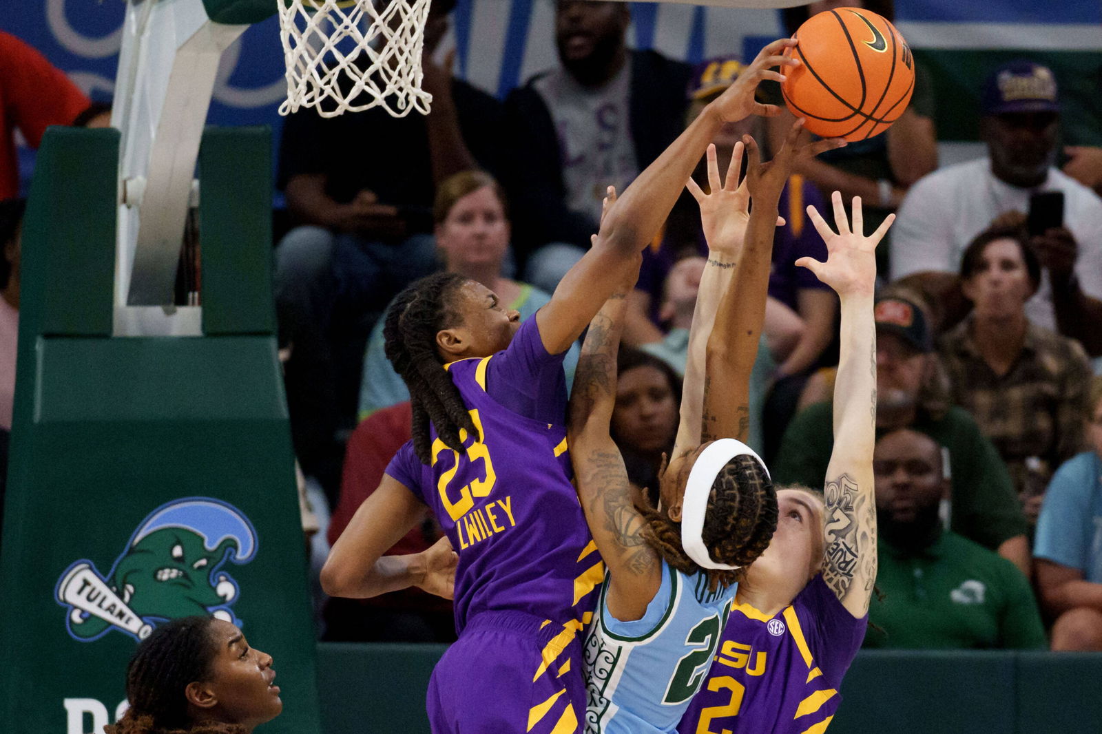 NCAA, College League, USA Womens Basketball: Louisiana State at Tulane Nov 17, 2025 New Orleans, Louisiana, USA LSU Tigers guard Milaysia Fulwiley 23 blocks the shot of Tulane Green Wave guard Kanija Daniel 21 during the second half at Avron B. Fogelman Arena in Devlin Fieldhouse. New Orleans Avron B. Fogelman Arena in Devlin Fieldhouse Louisiana USA, EDITORIAL USE ONLY PUBLICATIONxINxGERxSUIxAUTxONLY Copyright: xMatthewxHintonx 20251117_szo_ft8_0483