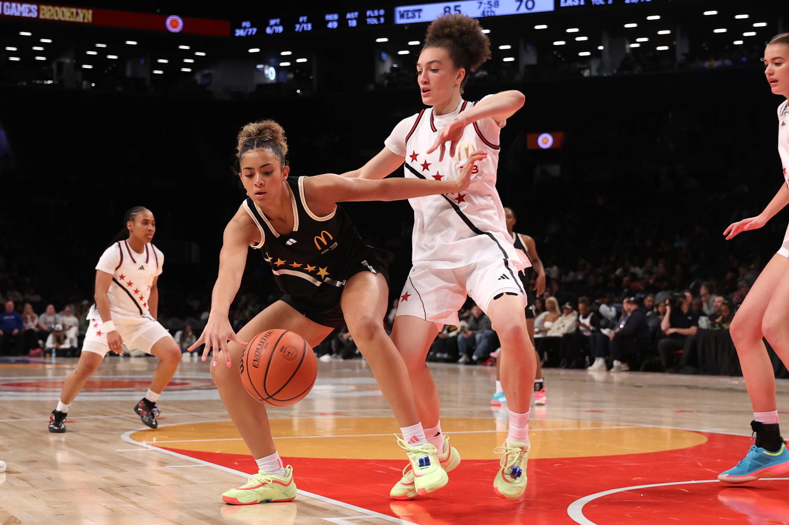 High School Basketball: McDonalds All American Girls Game Apr 1, 2025 Brooklyn, NY, USA McDonald s All American East guard Aaliyah Crump 23 and McDonald s All American West wing Grace Knox 23 compete for the ball during the second half of the game at Barclays Center. Brooklyn Barclays Center NY USA, EDITORIAL USE ONLY PUBLICATIONxINxGERxSUIxAUTxONLY Copyright: xPamelaxSmithx 20250401_ams_tp7_0071