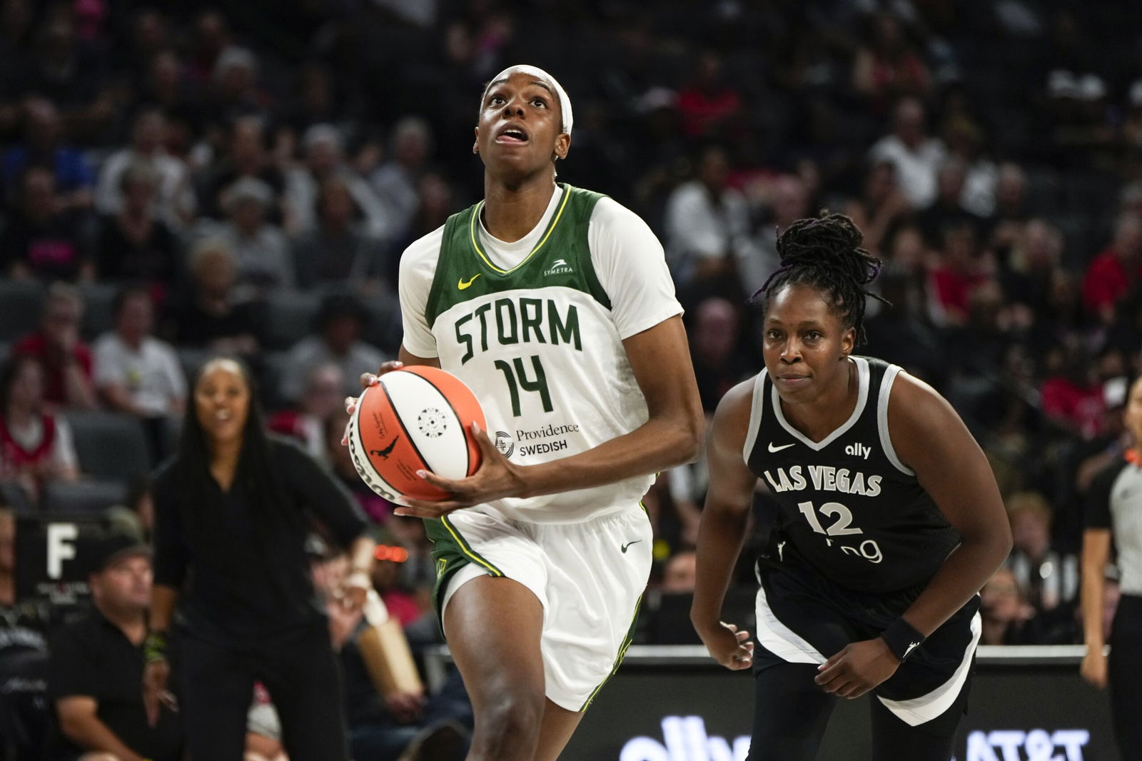 Aug 8, 2025; Las Vegas, Nevada, USA; Seattle Storm center Dominique Malonga (14) attempts to score a layup against Las Vegas Aces guard Chelsea Gray (12) during the second half of a WNBA basketball game at Michelob Ultra Arena. Mandatory Credit: Lucas Peltier-Imagn Images
